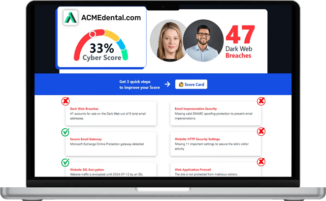 The Cyber Score Tool is a fast, easy way to identify risks in your IT environment. No downloads. No tech speak. Just real insights, like: